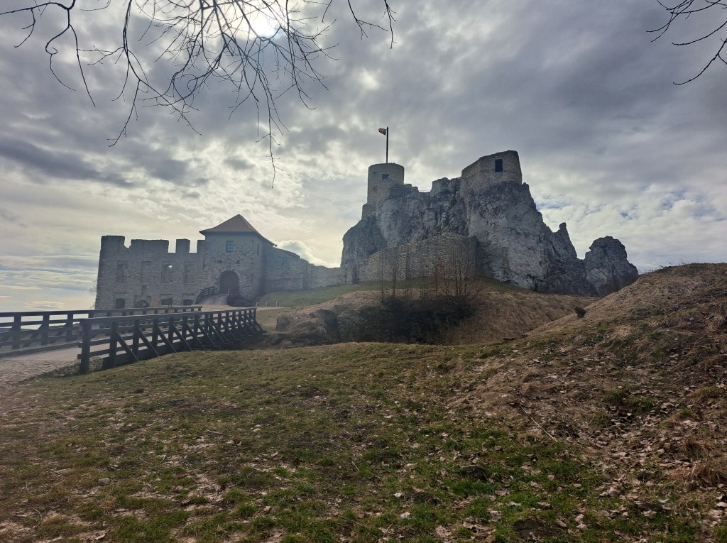 Kolejna podróż dopiero się rozpoczęła a już miałem niesamowitą przygodę. Niespodzianka czekała tuż za Olkuszem. Zawsze tam była, mijana i ignorowana szczególnie latem, gdy zieleń drzew widoki zasłania. Dziś jednak tego marcowego przedpołudnia nic widoków nie zasłaniało i budowla na szczycie góry w Rabsztynie krzyczała – chodź, wejdź, zobacz i zrób zdjęcie! Zjechałem na dwadzieścia minut. Wejście pod zamek w Rabsztynie jest łatwe i szybko okazało się, że w kilka minut można stanąć pod bramami zamku.