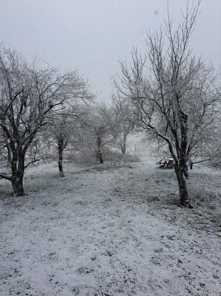 I tak w sobotę do późnej nocy gotowanie żurku i rozmowy o wszystkim co może nas interesować. Plany na najbliższe tygodnie, wyjazdy i spotkania. Planowanie Kupały, wyjazdów na rekonstrukcje historyczne itp. Opowieści komu i co udało się zdziałać, co poszło nie tak jak powinno i dlaczego. Co trzeba lepiej przygotować i jak się do tego zabrać. Zabawne historie o zwierzakach domowych. Pies, koty i inne przybywające do sadu na jabłka jak kuropatwy. Palenie w piecu do CO i zapach dymu. I tak do późna w sobotnią noc. Rano w niedzielę w sadzie jeszcze biało. Wychodzę na kawę do sadu chociaż chłód jest przejmujący i ostro wieje. Jednak musi być fotka z kawą w pamiątkowym kubku i koniecznie w sadzie. Ta poranna kawa uzmysławia mi, że za parę godzin będzie trzeba wracać … wracać do miasta. Jednak ciągle się nią delektuję póki jeszcze nie muszę się pakować. Trwa ciągle ranek i ta chwila jest moim świadomym wytchnieniem.