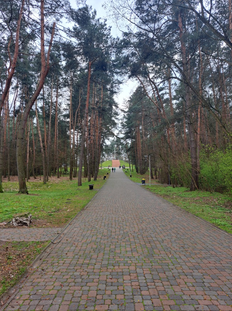 Dalej zatem aleją ku kopcowi poszlim, aby tam natknąć się na kolejne dwa kamienie pamiątkowe. Jeden mówi o setnej rocznicy ogłoszenia Uniwersału Połanieckiego, drugi zaś o tym, kiedy i dlaczego kopiec ten usypano. Przejście między kamieniami to droga po schodach na szczyt kopca, któren krzyżem jest zwieńczony a i kamień tam ci pamiątkowy spoczywa. Widok ze szczytu imponującym jest, bo to alejka, którą dopiero co szliśmy zdaje się ścieżynką a wkoło jeno las sosnowy rośnie.